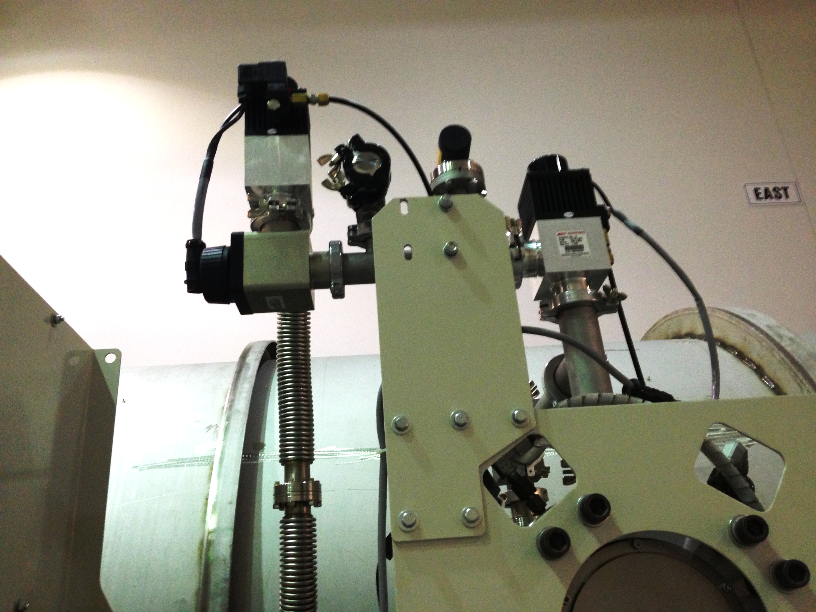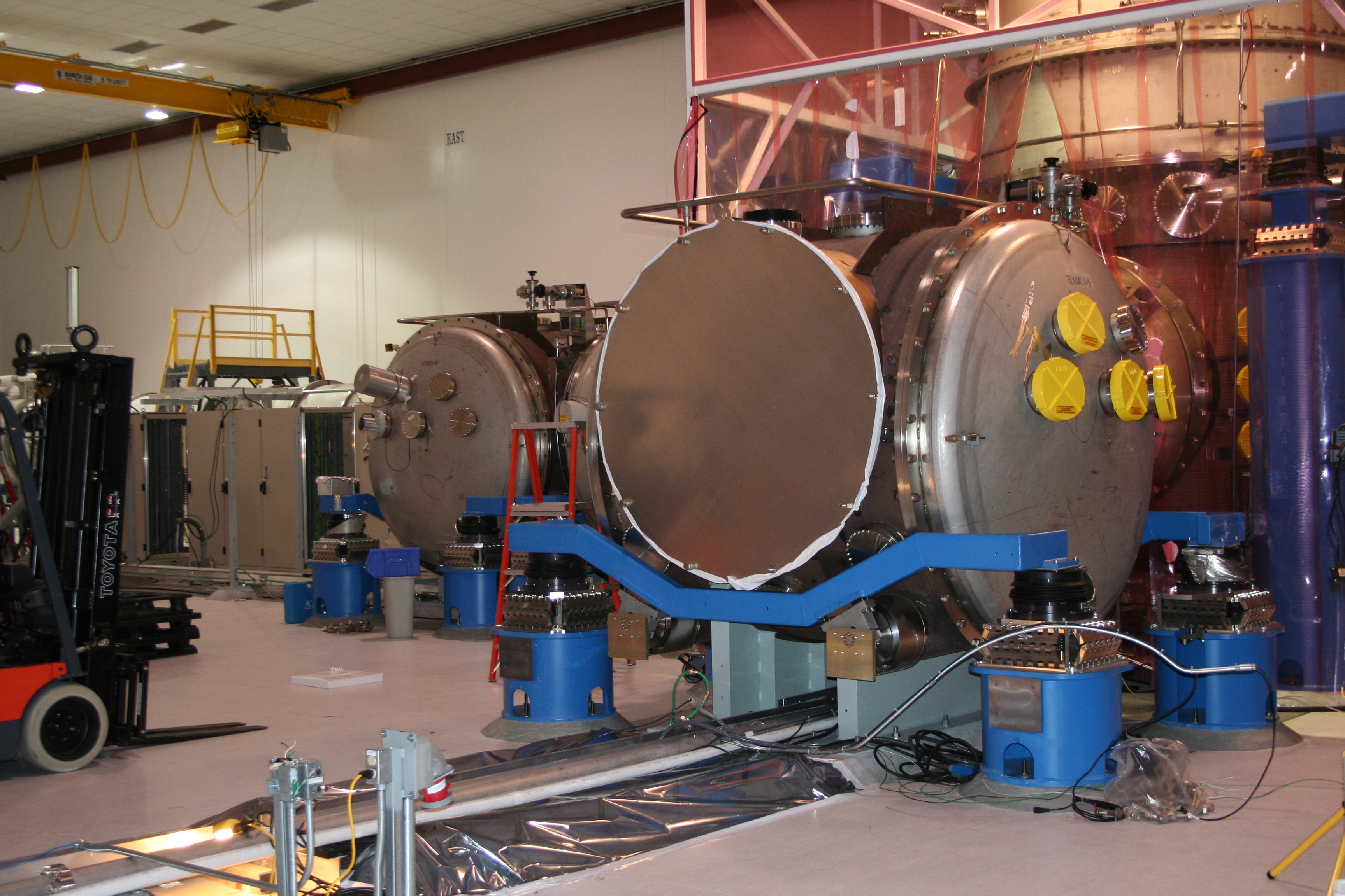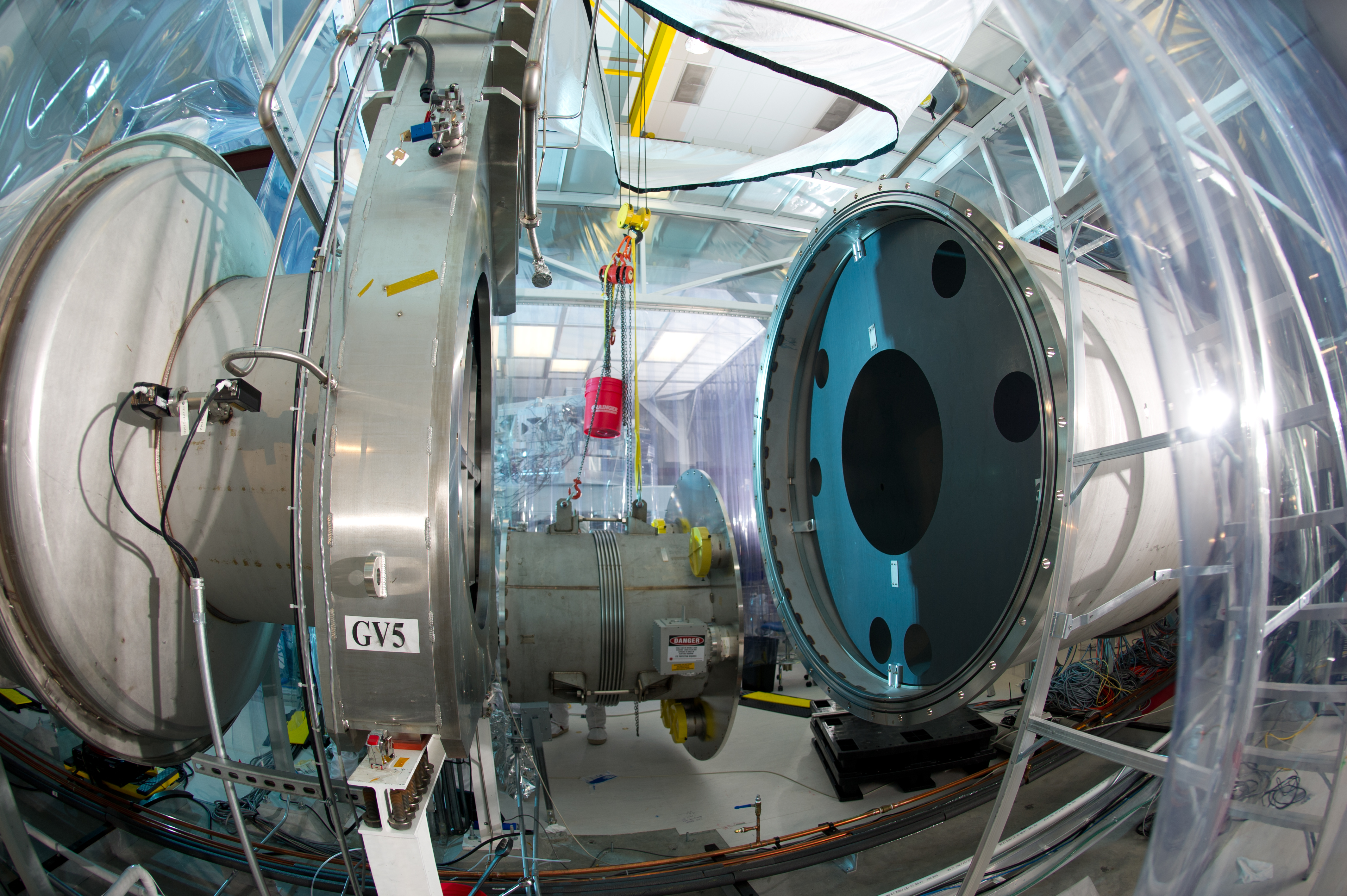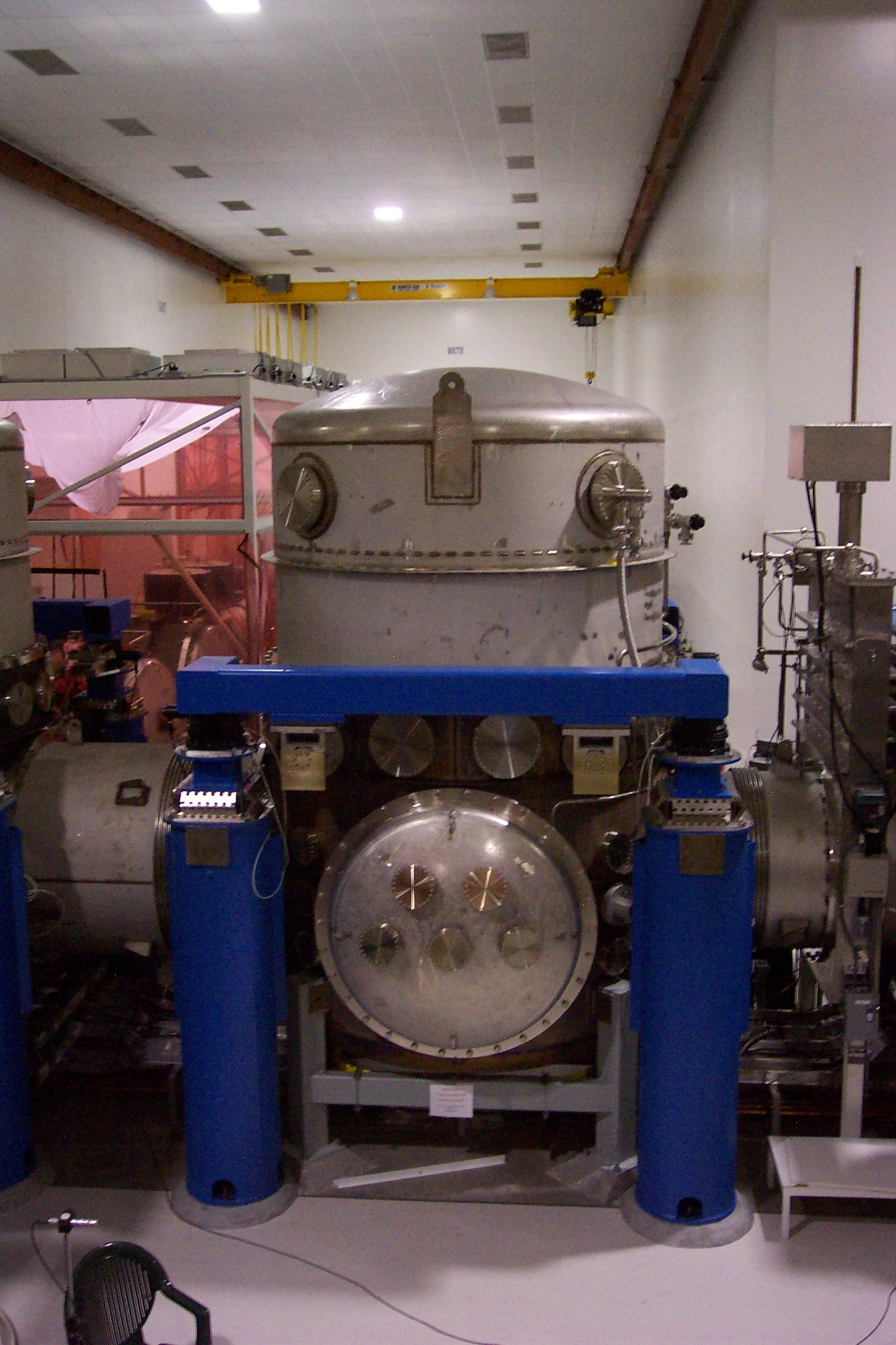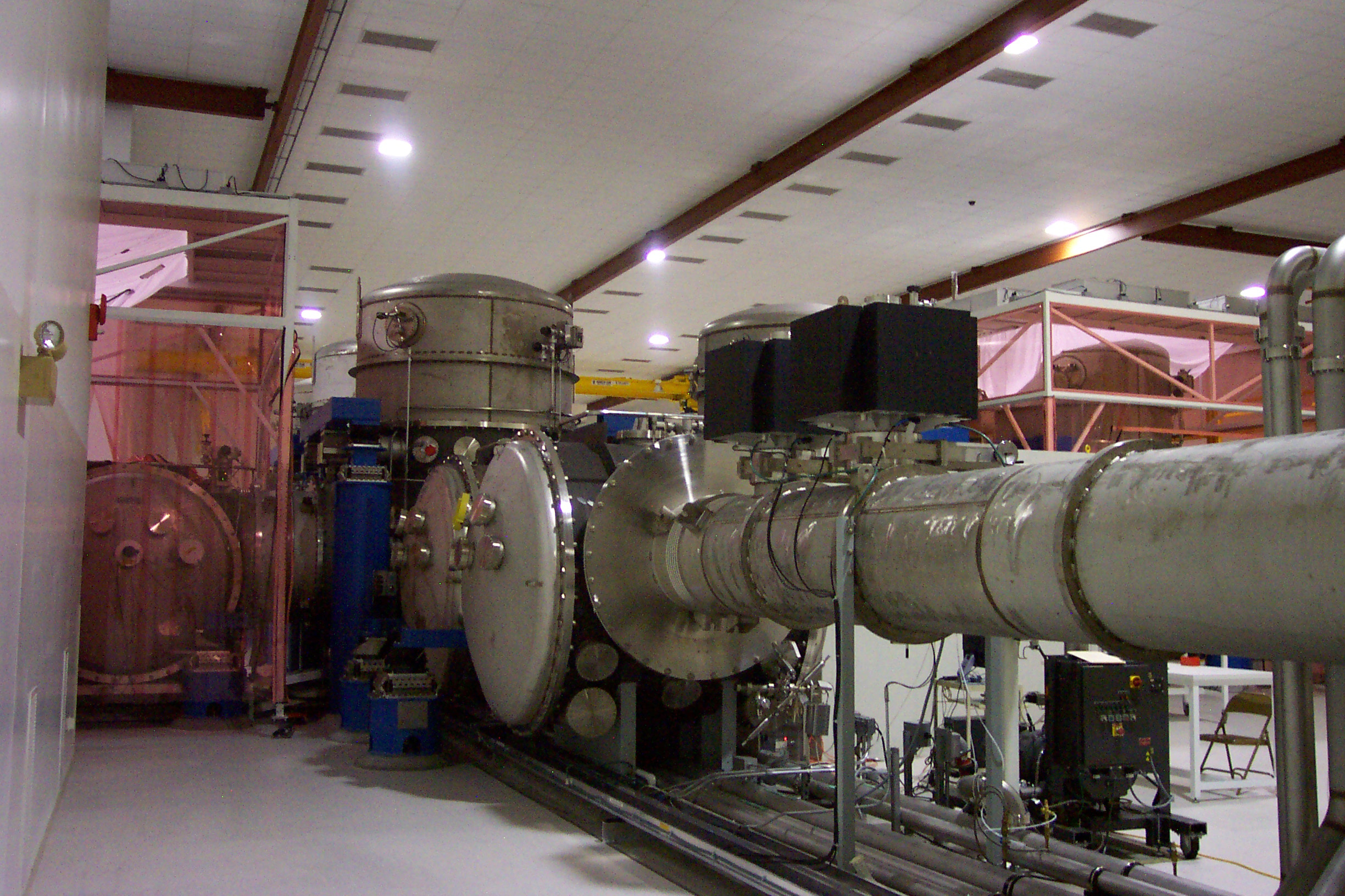 visible above the beam pipes to either side of the chambers