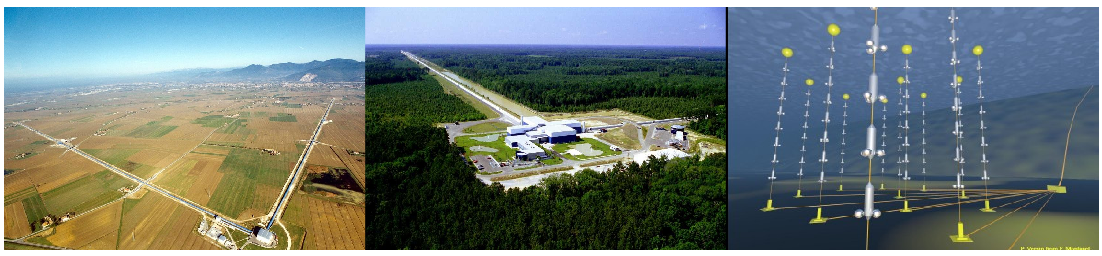 These pictures show the Virgo interferometer (on the left), the LIGO Livingston interferometer (in the center) and an artists' impression of the ANTARES neutrino telescope, which is at a depth of about 2500m in the Mediterranean Sea (on the right).
