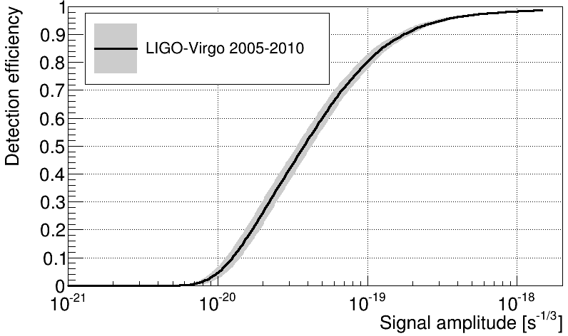 This plot shows the detection efficiency as a function of the cusp signal amplitude. It tells you the fraction of cosmic string cusp events of a given amplitude that our search should be able to find.