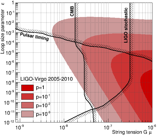 This plot presents existing constraints on cosmic string parameters: the string tension Gµ, the loop size parameter ε and the probability p that two string segments interact when they meet. Our analysis is able to reject the regions filled in red. For comparison, other constraints derived from searches of a GW background from cosmic strings (pulsar / CMB / LIGO stochastic) are given fixing p at 1e-3.
