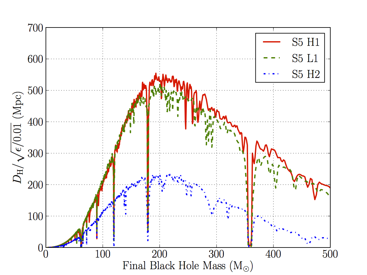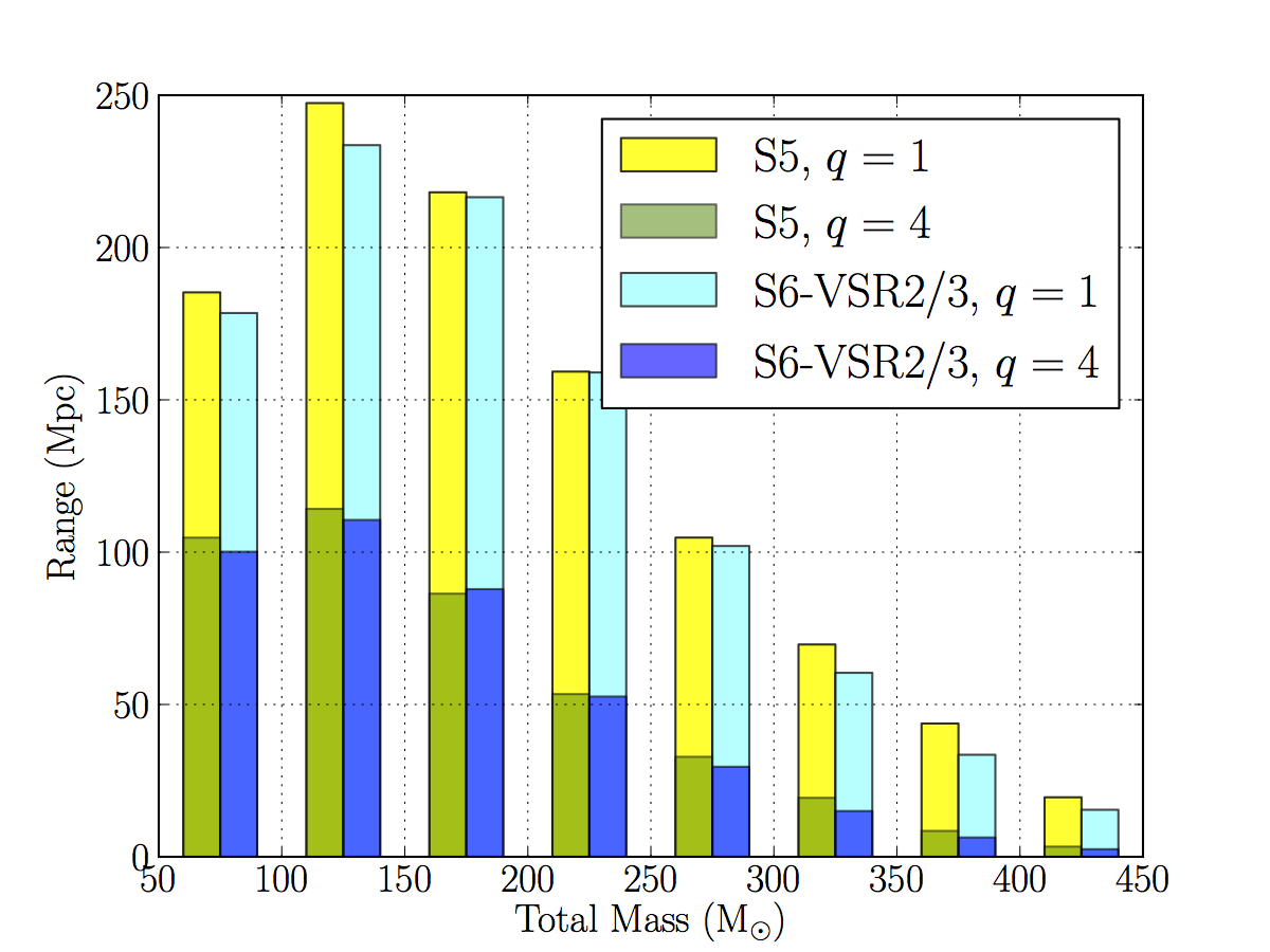 Figure 2: In order to understand the true sensitive distance of the search, rather than the horizon distance discussed in Fig. (1), we added simulated signals from non-spinning, merging IMBHs to the data and tested our ability to detect them. The figure shows sensitive distances for our search over LIGO's fifth science run (S5) and over LIGO's sixth science run and Virgo's science runs 2 and 3 (S6-VSR2/3). The simulated signals were given a random sky location and orientation as well as a range of masses between 50 and 450 solar masses. Additionally, since the sensitivity of the search also depends on the ratio (q) of masses of the two merging black holes, for simplicity, we choose to explore only mass ratios of 1:1 and 4:1. We are most sensitive to perturbed black holes with total masses in the range 100 to 150 solar masses resulting from two merging IMBHs with equal masses. The average sensitive distance in this case was ~ 240 Megaparsecs (783 million light years). However, if the mass ratio of the two merging IMBHs was instead 4:1, the average sensitive distance decreases by more than a factor of two to ~ 110 Megaparsecs (359 million light years).