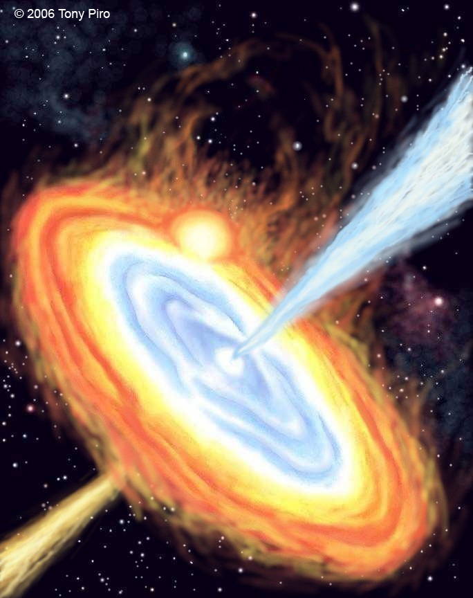 An artist's impression of a gamma-ray burst. A blob of matter has formed in the accretion disk. The motion of the blob may produce gravitational waves. (Image: Tony Piro) |