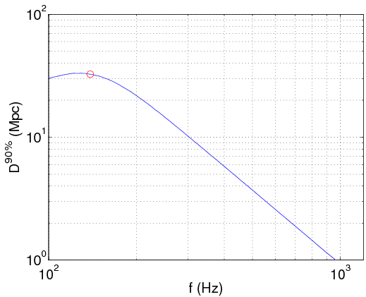 This plot shows the lower limits on the distance to long gamma-ray bursts as a function of gravitational-wave frequency assuming that an energy equivalent to one tenth the mass of our sun is emitted in gravitational waves. The limits are calculated so that we are 90% confident that the true distance is larger than the limits. The distances are given in Megaparsecs (Mpc). One Megaparsec is equivalent to 3.26 million light years.