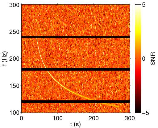 This plot shows signal strength (labeled "SNR" for signal-to-noise ratio) as a function of both time (x-axis) and gravitational-wave frequency (y-axis) for a simulated gravitational wave added to detector noise. The color scale indicates how strong the signal is with orange corresponding to no signal and white corresponding to a strong signal. The simulated signal appears as a curved yellow track. Detector noise produces fluctuations in the signal strength throughout the plot even where no signal is present. The goal of this analysis is to find gravitational-wave tracks like this one buried in detector noise, though a realistic signal would be much weaker. This example has been made very loud so it is easy to see. The black horizontal lines indicate frequency bands which have been excluded for being too noisy.