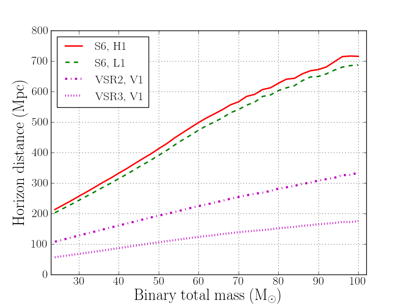 The results of these numerical simulations are combined with theoretical knowledge of how the initial 'chirp' and final 'ringdown' parts of the waveform behave in general relativity, to generate families of complete waveforms. We use these to try and extract signals from the noisy detector outputs, and also to evaluate as accurately as possible how sensitive our search is. For instance, if there had been a merger of two black holes each 20 times as massive as the Sun, when the LIGO and Virgo detectors were operating at their best sensitivity, the signal could have been seen up to a maximum distance of about 300 Mpc (1 Mpc = 1 million parsec, about 3.2 million light-years) away from us — 400 times farther than the Andromeda galaxy.