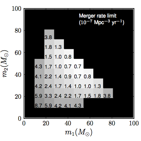 - Upper limit: A statement about the maximum value a physical quantity is likely to have given the results of our search. Here, we set upper limits on the rate of mergers of binary black holes in the nearby Universe. We choose to set '90% upper limits', meaning that the probability that the true merger rate is larger than our estimated upper limit is at most 10%.