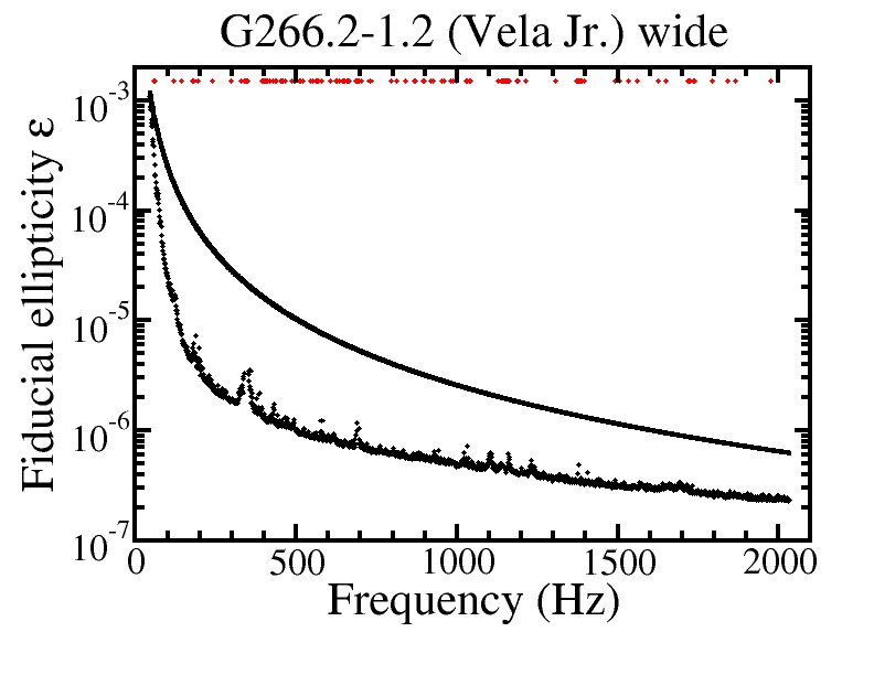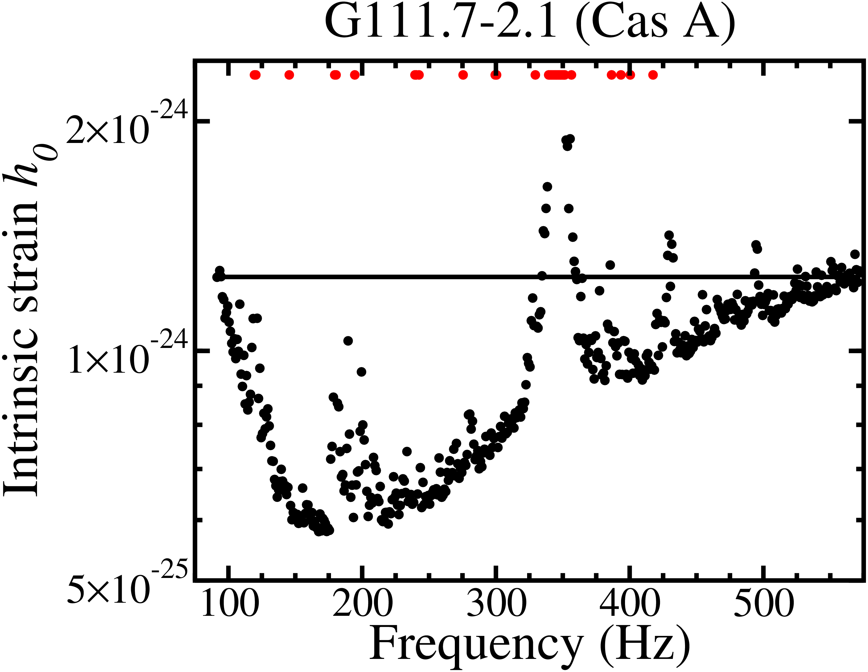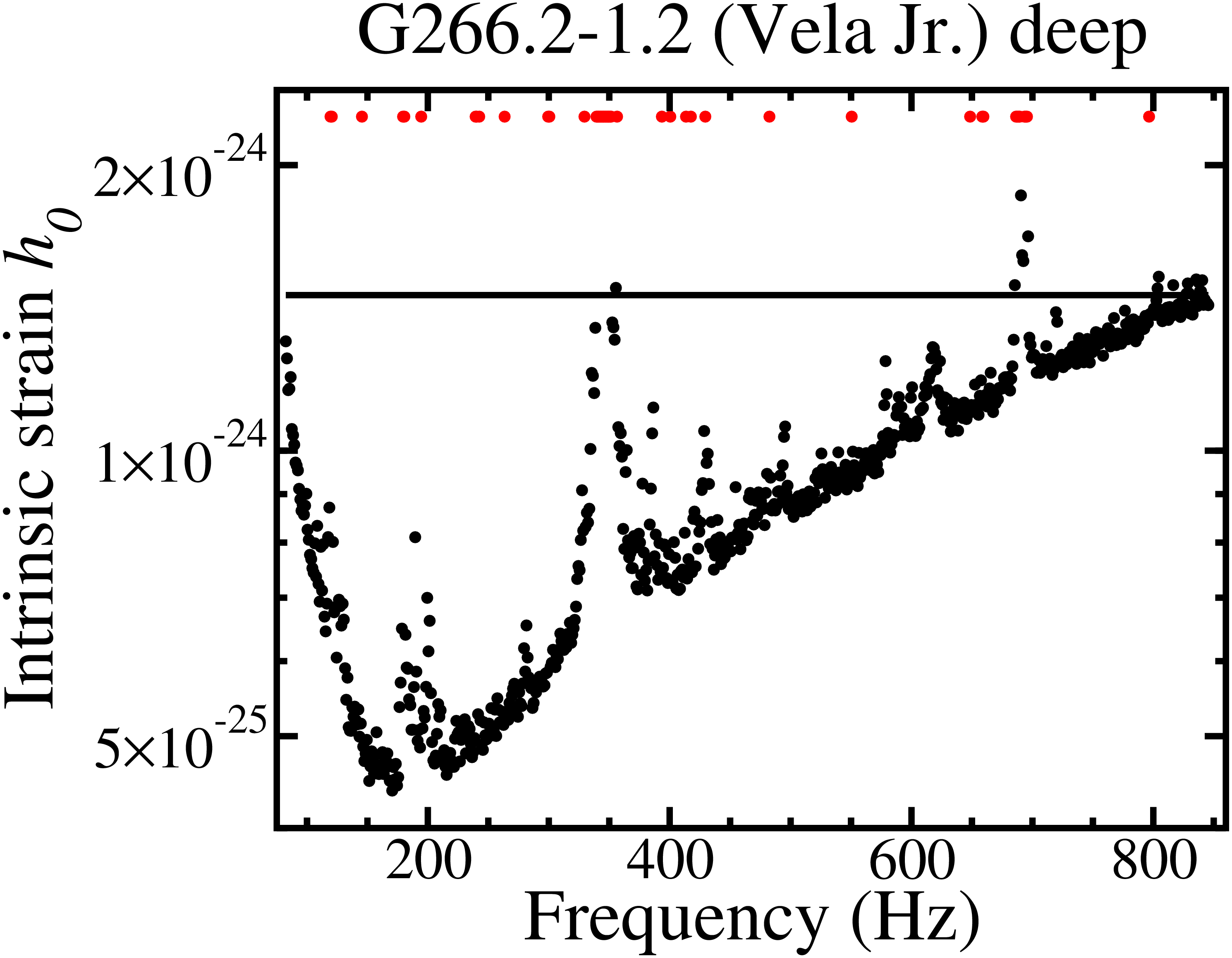 We didn't find any gravitational waves, so we set statistical upper limits on the signals that could be buried in the detector noise. These upper limits on signal strength as a function of frequency pop up when you hover the mouse over supernova remnant names in the figure below. At the right of the page we also show three figures for one search, the wide-band one for for Vela Jr. The upper limits depend on frequency mainly because the detector noise depends on frequency, and each upper limit dot covers a 1 Hz band of frequencies. All of the search upper limits (black dots) beat (are lower than) the best signal we could hope for (solid black lines) based on energy conservation and the age of and distance to each remnant, sometimes by a lot! (The red dots show 1 Hz bands where we set no limit due to narrow-band instrumental artifacts.) When Advanced LIGO and Advanced Virgo run, starting in 2015, we'll be able to look for fainter and fainter signals as the noise improves.