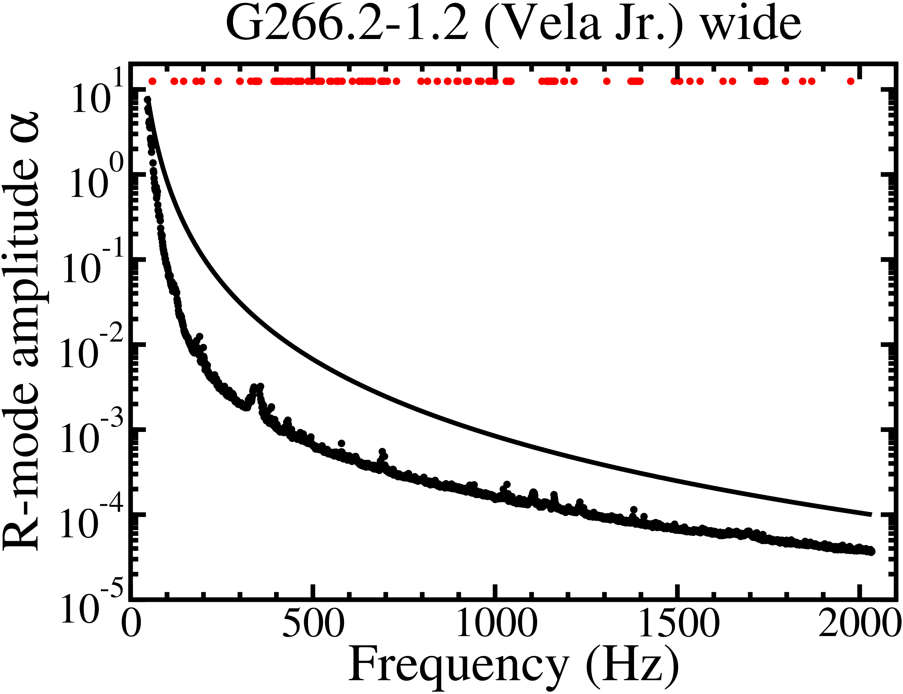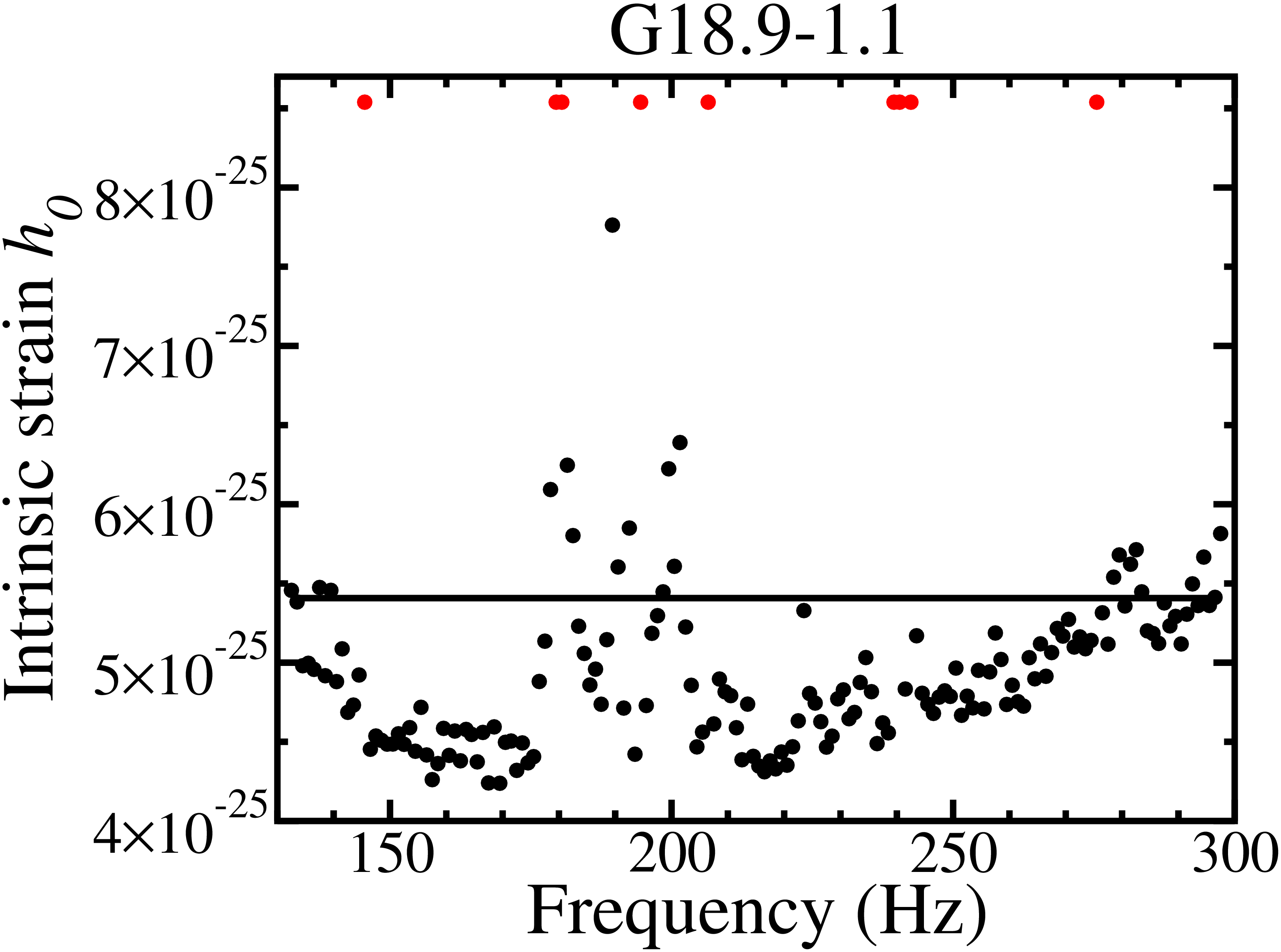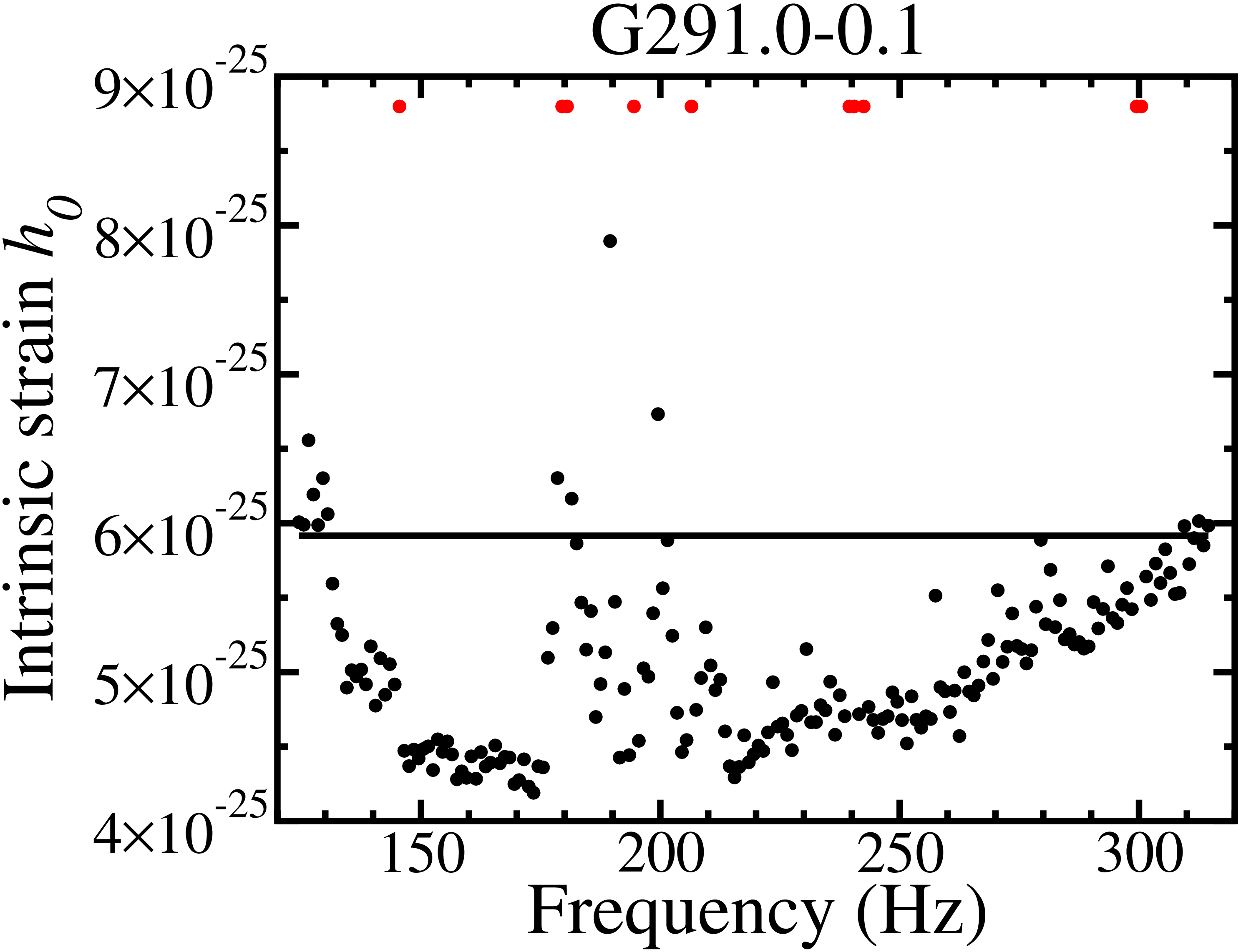 We didn't find any gravitational waves, so we set statistical upper limits on the signals that could be buried in the detector noise. These upper limits on signal strength as a function of frequency pop up when you hover the mouse over supernova remnant names in the figure below. At the right of the page we also show three figures for one search, the wide-band one for for Vela Jr. The upper limits depend on frequency mainly because the detector noise depends on frequency, and each upper limit dot covers a 1 Hz band of frequencies. All of the search upper limits (black dots) beat (are lower than) the best signal we could hope for (solid black lines) based on energy conservation and the age of and distance to each remnant, sometimes by a lot! (The red dots show 1 Hz bands where we set no limit due to narrow-band instrumental artifacts.) When Advanced LIGO and Advanced Virgo run, starting in 2015, we'll be able to look for fainter and fainter signals as the noise improves.
