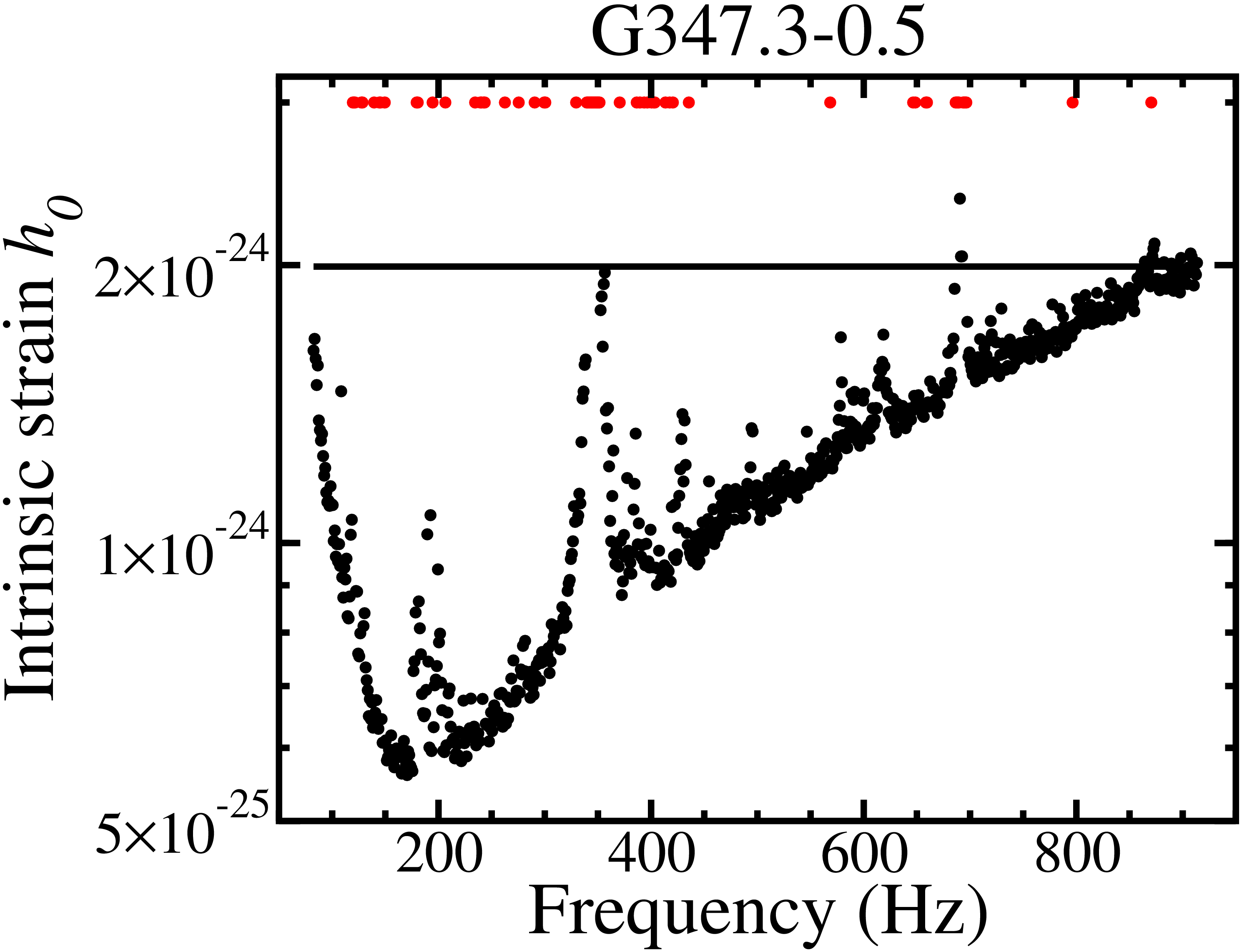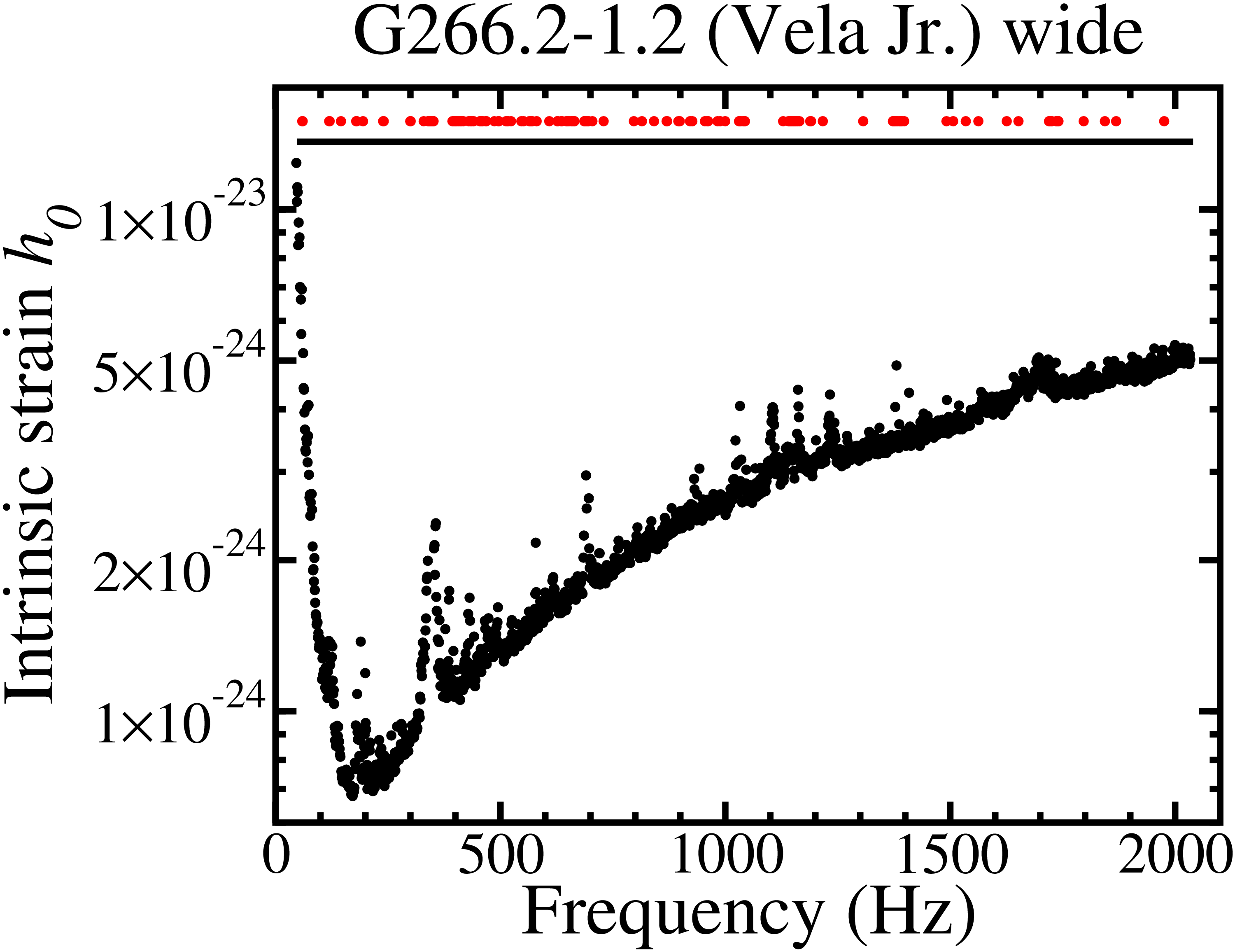 Upper limits on gravitational wave signal strength versus frequency for the Vela Jr. wide search. Intrinsic strain is a measure of signal strength which is basically the fractional squeezing and stretching of spacetime due to gravitational waves that we would see with an optimally oriented neutron star and detector. The actual strain measured by a detector is typically less by a factor of two or three due to those orientations and the sky location of the neutron star.