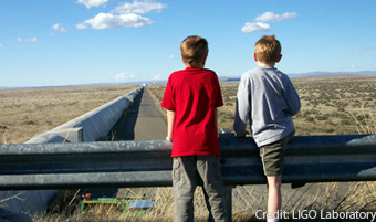 Visitors at LIGO Hanford Observatory gaze down the site's X arm. Half of the 4-kilometer length of the arm is visible in the photo. (Credit: LIGO Laboratory)