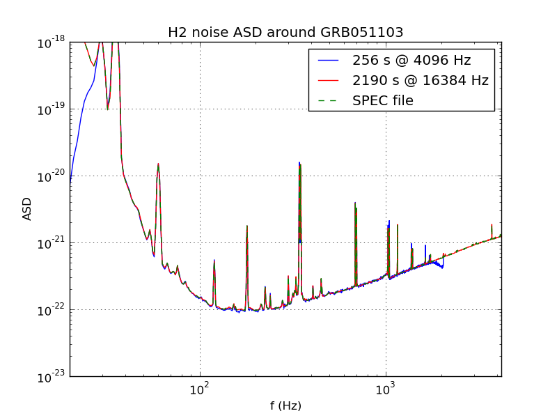 - The overall fractional uncertainty in amplitude calibration is estimated at 25% for both H2 and L1 data, in the band between 40 and 2000 Hz (and uncalibrated outside this band). This is significantly larger than typical science run calibration uncertainties (see e.g., Calibration of the LIGO Gravitational Wave Detectors in the Fifth Science Run) as fewer calibration measurements were available from the data taking around the GRB051103 time.