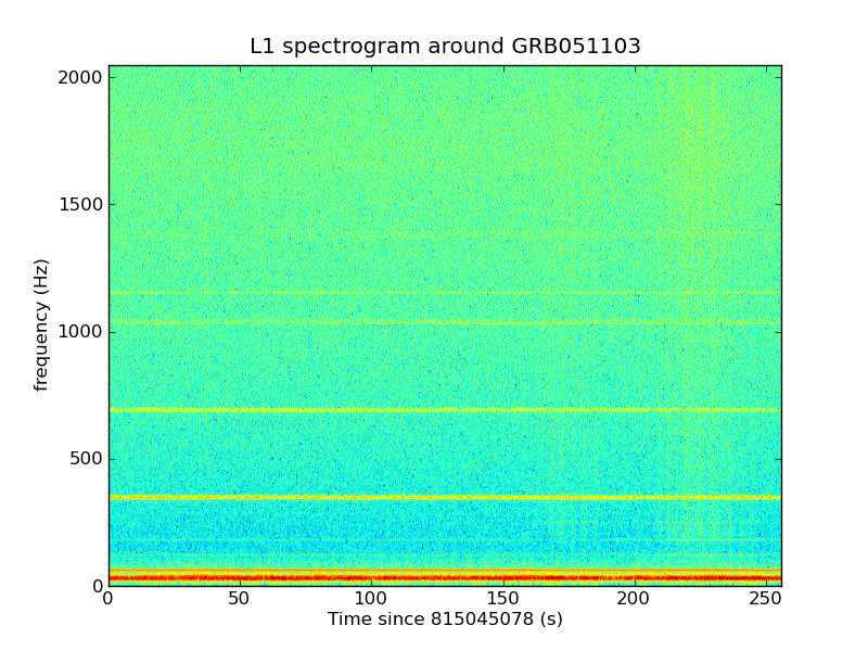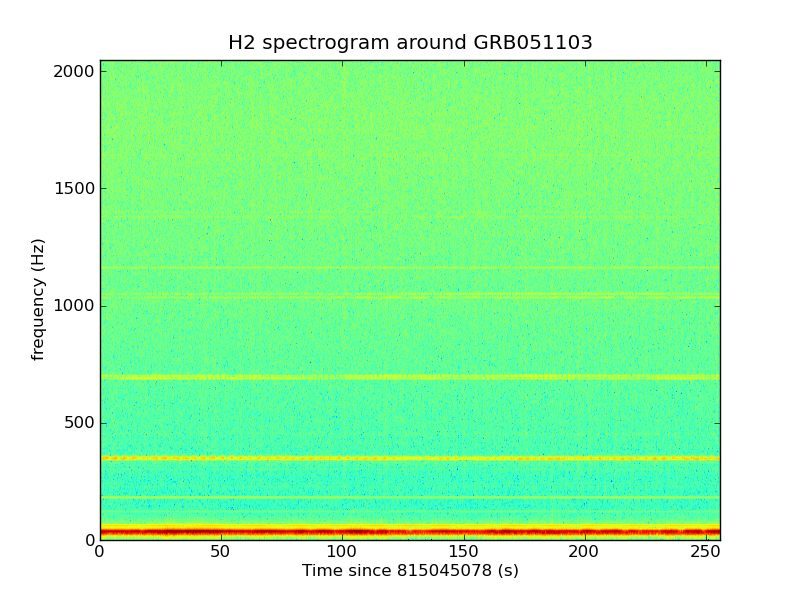 Omegagram of strain data from H2 near the time of GRB051103. (More information on omegagrams).