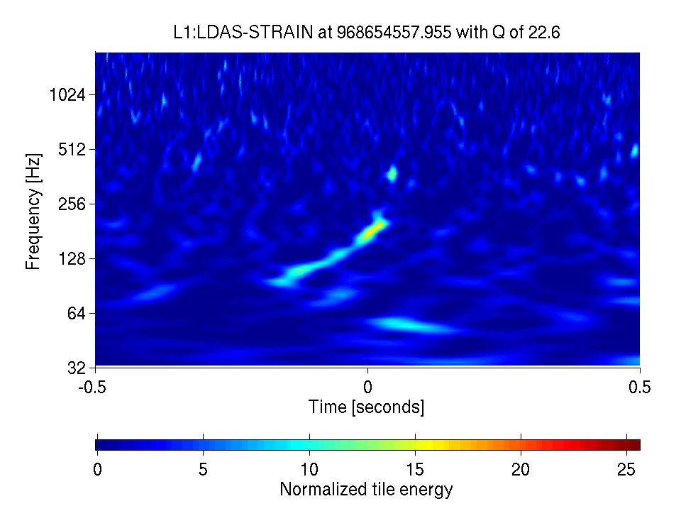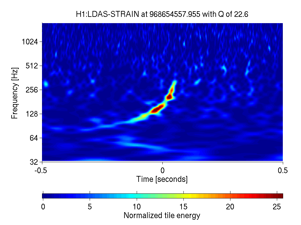 The figures below actually show "omegagrams" of the event. These are analogous to time-frequency spectrograms, except the basis set consists of sine-Gaussians rather than sine waves, with logarithmically-spaced central frequencies, and (in this case) quality factor Q = 22.6. The data are whitened and band-passed, and the plots are smoothed. For Gaussian noise in the absence of signal, these plots are typically all blue. The fact that the chirping signal power is clearly visible in the first two plots indicates that the signal is significantly larger than detection threshold, and these plots are qualitatively very similar to simulations with parameters close to the ones recovered in our search.