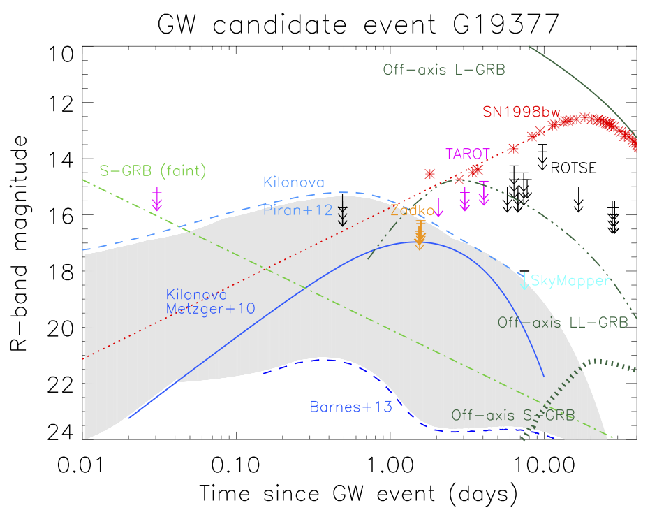 Línea de tiempo para el evento G19377 donde se muestra cuándo cada telescopio observó las regiones solicitadas como se indica en la figura anterior. El tiempo cero es la hora del candidato a evento de ondas gravitacionales. Se muestran curvas de luz modelo para varias fuentes (asumiendo una distancia de 30 Mpc) para la comparación.