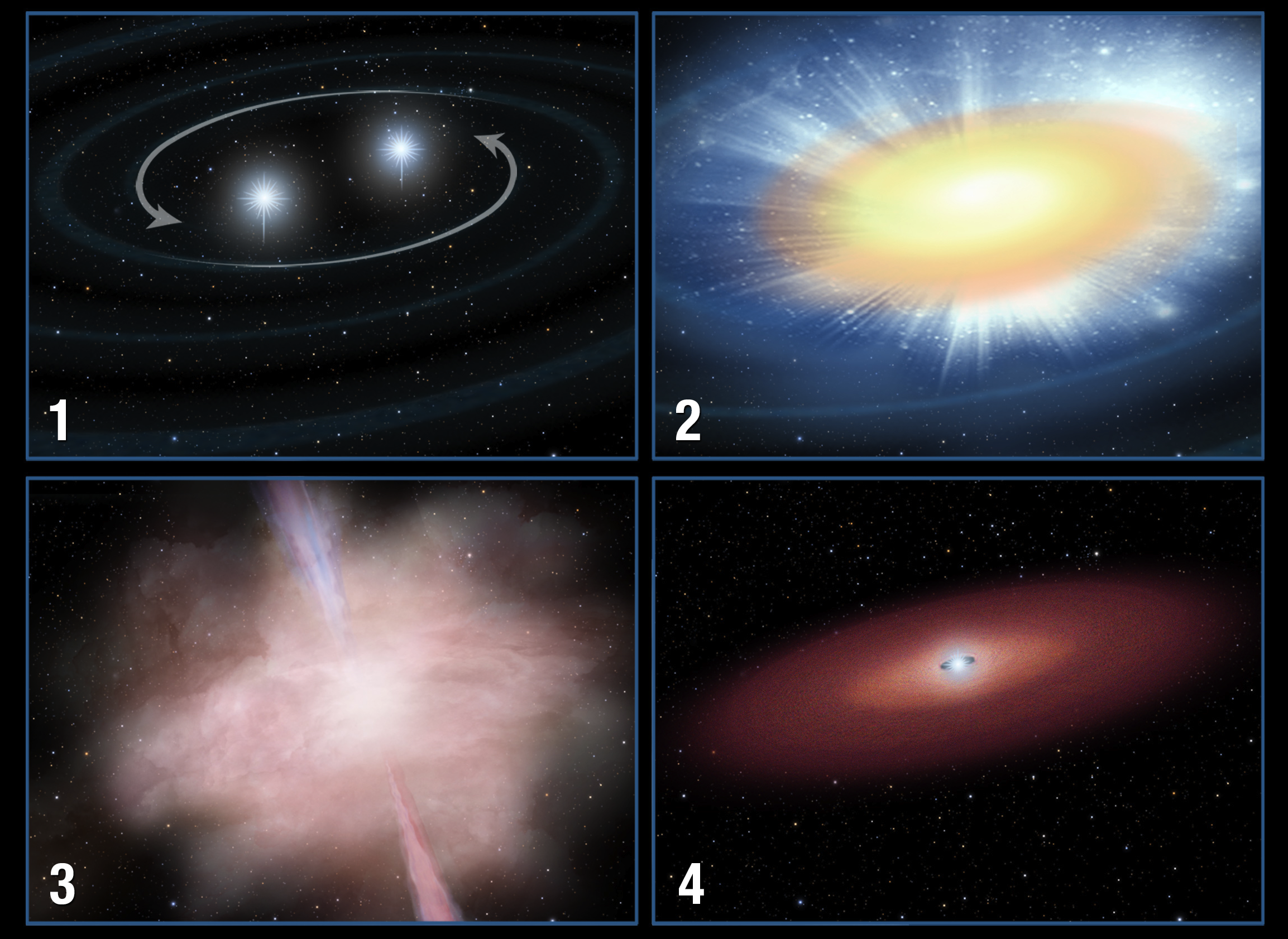 Se espera que algunas de las fuentes más fuertes de las ondas gravitacionales produzcan suficiente luz como para ser visibles desde telescopios espaciales y telescopios localizados sobre la Tierra. Por ejemplo, las parejas de estrellas de neutrones emiten una gran cantidad de energía de ondas gravitacionales cuando se mueven en espiral una respecto a la otra (panel 1 en la imagen de la derecha). Cuando los dos objetos se fusionan, producen material altamente radiactivo (panel 2). Se cree que un estallido de rayos gamma de poca duración (panel 3), que acompaña a la fusión, proviene de estrechos chorros de radiación de alta energía, expulsados por la fusión de estas estrellas, durante aproximadamente una décima de segundo. Gran parte de los remanentes de la explosión forman un disco alrededor del objeto resultante de la fusión, que probablemente sea un agujero negro (panel 4).