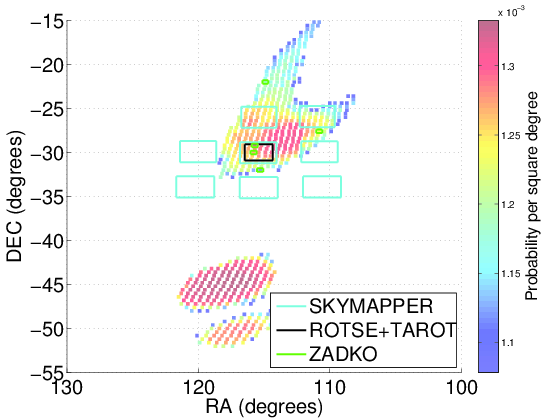 Mapa del cielo de ondas gravitacionales para el evento G19377 que se produjo el 16 de septiembre de 2010. Más adelante se reveló que este evento fue una inyección a ciegas. El mapa del cielo muestra la probabilidad de que cada lugar sea la ubicación de la verdadera fuente, basada puramente en los datos de los detectores de ondas gravitacionales. Las localizaciones de las áreas observadas por los telescopios de este evento de ondas gravitacionales están indicadas. Cada evento de ondas gravitacionales tiene un mapa del cielo similar a este.