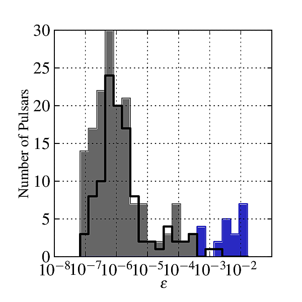 Histogramas de los límites superiores en términos de elipticidades, ε de las estrellas. La The elipticidad se puede convertir aproximadamente en un tamaño de "montaña" mediante la multiplicación por el radio aproximado de la estrella de neutrones de 10 km (para más detalles sobre las limitaciones de ondas gravitacionales en la forma de las estrellas de neutrones ver este artículo). El histograma coloreado en gris, muestra los resultados utilizando los últimos datos de LIGO S6, Virgo VSR2 y datos de VSR4. El histograma coloreado en azul muestra el resultado para varios pulsares que sólo utilizan datos de Virgo VSR2 y de VSR4, y la línea negra muestra los resultados utilizando los datos de LIGO S5.