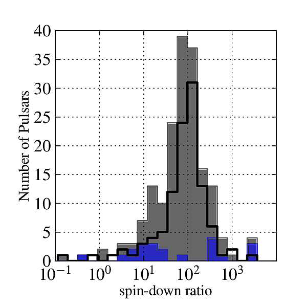Histogramas de los límites superiores en términos de la relación del límite superior observado al límite de spin-down. El histograma de color gris muestra los resultados utilizando los últimos datos de LIGO S6 y Virgo VSR2 y VSR4, el histograma de color azul muestra el resultado para varios púlsares que sólo utilizan datos de Virgo VSR2 y VSR4, y la línea negra muestra los resultados utilizando los datos de LIGO S5.